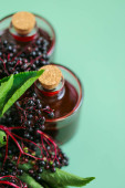 Syrop z czarnego bzu. Jagody Sambucus. Żniwa bzu czarnego.Syrop sambuksu.Gałęzie bzu czarnego. syrop w butelce i pęczki jagód bzu czarnego na fioletowym tle.