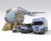 3D renderowanie mapy świata, stos paczek i wózek widłowy, van, ciężarówka pociąg, kontenerowiec towarowy i samolot