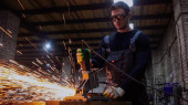 Ciężka Inżynieria Przemysłu Wnętrze fabryki z robotnikiem przemysłowym za pomocą szlifierki kątowej i cięcia rur metalowych. Wykonawca w zakresie bezpieczeństwa Jednolite i twarde Kapelusze Produkcja konstrukcji metalowych. Wysokiej jakości