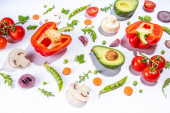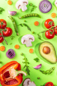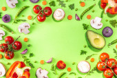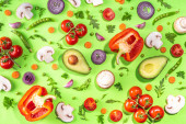 Zdjęcie "Różne świeże warzywa. Surowe warzywa organiczne, składniki sałatkowe jasne płaskowyże na jasnozielonym tle. Zdrowa dieta wspólna dieta, wegańskie jedzenie wegetariańskie tło przestrzeń kopia" może być wykorzystywane do celów osobistych i komercyjnych zgodnie z warunkami zakupionej licencji Royalty-free. Obraz jest dostępny do pobrania w jakości wysokiej rozdzielczości do 5760x3840.