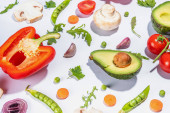Różne świeże warzywa. Surowe warzywa organiczne, składniki sałatkowe jasne płaskowyże na jasnozielonym tle. Zdrowa dieta wspólna dieta, wegańskie jedzenie wegetariańskie tło przestrzeń kopia