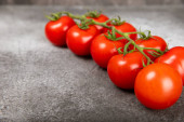 Świeże czerwone pomidory na brązowym tle tekstury. Pomidory wiśniowe z zielonymi łodygami. świeże warzywa. Skopiuj space.organic żywności