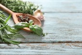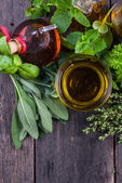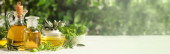 Różne świeże zioła z olejkami na drewnianym stole, miejsce na tekst. Projekt banera