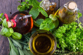 Zdjęcie "Różne świeże zioła z olejkami na drewnianym stole, miejsce na tekst. Projekt banera" może być wykorzystywane do celów osobistych i komercyjnych zgodnie z warunkami zakupionej licencji Royalty-free. Obraz jest dostępny do pobrania w jakości wysokiej rozdzielczości do 5760x3840.
