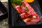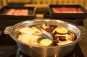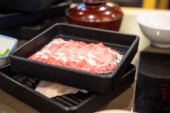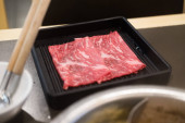 Cienko krojone mięso i świeże warzywa do tradycyjnego japońskiego hot pot, shabu-shabu, sukiyaki.