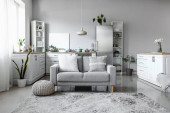 Wnętrze nowoczesnego salonu z wygodną sofą, lampą i roślinnością