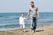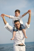 szczęśliwy ojciec i syn bawić i cieszyć się razem na plaży