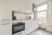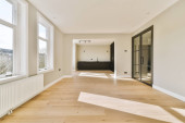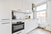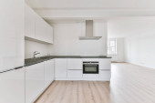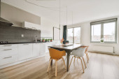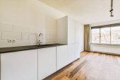 Zdjęcie "Wnętrze pustej białej kuchni z oknami i drewnianą podłogą parkietową" może być wykorzystywane do celów osobistych i komercyjnych zgodnie z warunkami zakupionej licencji Royalty-free. Obraz jest dostępny do pobrania w jakości wysokiej rozdzielczości do 5760x3840.