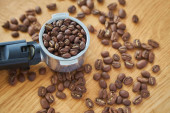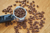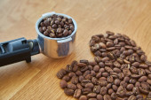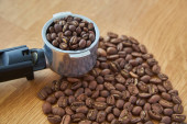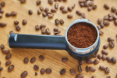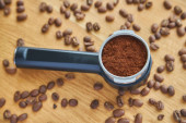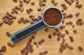 róg ekspresu do kawy, z mieloną kawą w środku, na tle ziaren kawy