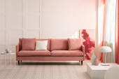 Zdjęcie "Różowa ławka z poduszką i stołem w świetlicy" może być wykorzystywane do celów osobistych i komercyjnych zgodnie z warunkami zakupionej licencji Royalty-free. Obraz jest dostępny do pobrania w jakości wysokiej rozdzielczości do 5760x3840.