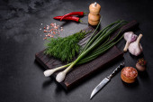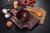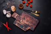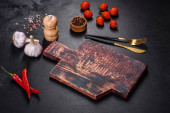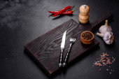 Pusta płyta z nożem, widelcem lub łyżką z drewnianą deską do krojenia na ciemnym betonowym tle. Przygotowanie urządzeń i składników do domowego gotowania