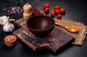 Zdjęcie "Pusta płyta z nożem, widelcem lub łyżką z drewnianą deską do krojenia na ciemnym betonowym tle. Przygotowanie urządzeń i składników do domowego gotowania" może być wykorzystywane do celów osobistych i komercyjnych zgodnie z warunkami zakupionej licencji Royalty-free. Obraz jest dostępny do pobrania w jakości wysokiej rozdzielczości do 5760x3840.