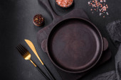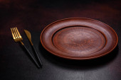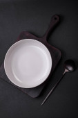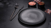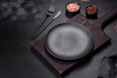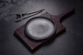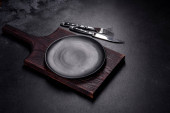 Pusta płyta z nożem, widelcem lub łyżką z drewnianą deską do krojenia na ciemnym betonowym tle. Przygotowanie urządzeń i składników do domowego gotowania