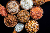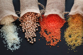 Zdjęcie "Czerwona soczewica, ciecierzyca, biały ryż i bulwy wylewa się z worka juty na czarną powierzchnię z miejsca kopiowania.Koncepcja zbiorów" może być wykorzystywane do celów osobistych i komercyjnych zgodnie z warunkami zakupionej licencji Royalty-free. Obraz jest dostępny do pobrania w jakości wysokiej rozdzielczości do 5760x3840.