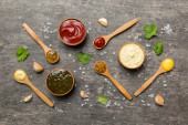 Wiele różnych sosów i ziół na stole, płaski widok leżał na górze. sosy z przyprawami zdrowa koncepcja.