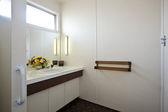 Wejście do łazienki w nowoczesnym apartamencie. Drzwi łazienki z niebieskimi ścianami i wanną