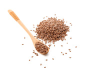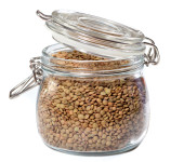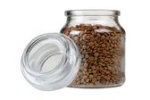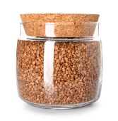 Słoik szklany i drewniana łyżka z ziarnami gryki na białym tle