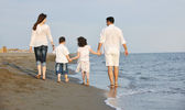 szczęśliwa młoda rodzina baw się na plaży o zachodzie słońca
