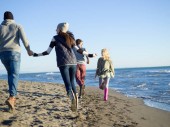 szczęśliwa młoda rodzina baw się dobrze na plaży