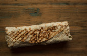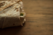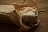Proces gotowania owijania kurczaka na stole kuchennym w domu koncepcji. Domowej roboty kebab z bliska. Świeże cienkie lavash lub chlebek pita roll z shawarma kanapki z ingridients wewnątrz.