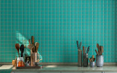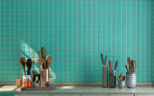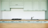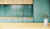 Makijaż studio kuchnia wystrój wnętrz i dekoracji w minimalnym i nowoczesnym stylu Japandi z płytek zielona ściana. 3d mieszkanie pokój wnętrze.