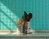 Zdjęcie "Makijaż studio kuchnia wystrój wnętrz i dekoracji w minimalnym i nowoczesnym stylu Japandi z płytek zielona ściana. 3d mieszkanie pokój wnętrze." może być wykorzystywane do celów osobistych i komercyjnych zgodnie z warunkami zakupionej licencji Royalty-free. Obraz jest dostępny do pobrania w jakości wysokiej rozdzielczości do 5760x3840.