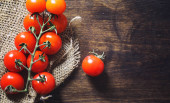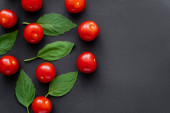 Widok z góry świeże pomidory wiśniowe na worek tkaniny na czarnym tle