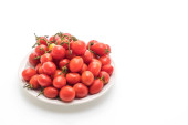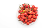 Widok z góry świeże pomidory wiśniowe na gałęzi w misce izolowane na białym