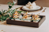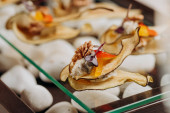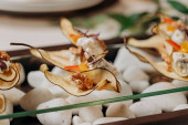 Suszone owoce w plasterkach Gruszki z serem wiejskim i orzechami włoskimi - zdrowy wegański deser bez cukru, podawany do furshet w restauracji