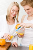 szczęśliwa para śniadanie zrobić rano sok pomarańczowy