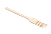 Drewniane jednorazowe brązowe widelce na białym, izolowanym tle, zestaw