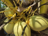 Owoce cytrusowe wystawione na sprzedaż w sklepie z owocami. Pomarańcze umieszczone są w pomarańczowym drewnianym uchwycie.