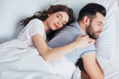 Para miłosnych uścisków razem leżących na białym łóżku po przebudzeniu szczęśliwy ranek