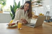 Atrakcyjna młoda kobieta w szlafroku, korzystająca ze smartfona podczas spędzania czasu w nowoczesnej kuchni
