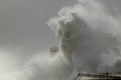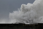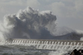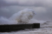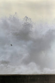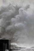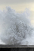 Wielka fala morska splash w molo od północnego wybrzeża Portugalii.