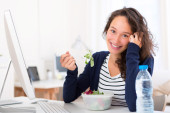 Młody student atrakcyjne jedzenie sałatka podczas pracy