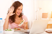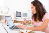 Zdjęcie "Młody student atrakcyjne jedzenie sałatka podczas pracy" może być wykorzystywane do celów osobistych i komercyjnych zgodnie z warunkami zakupionej licencji Royalty-free. Obraz jest dostępny do pobrania w jakości wysokiej rozdzielczości do 5760x3840.