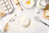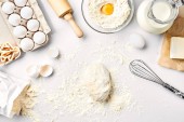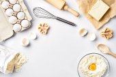 Zdjęcie "Przygotowanie ciasta. Pomiar ilości składników w przepisie. Składniki ciasta: mąka, jajka, wałek, trzepaczka, mleko, masło, śmietana. Widok z góry, miejsce na tekst. Nadal." może być wykorzystywane do celów osobistych i komercyjnych zgodnie z warunkami zakupionej licencji Royalty-free. Obraz jest dostępny do pobrania w jakości wysokiej rozdzielczości do 5760x3840.