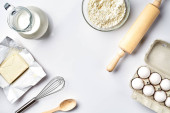Przygotowanie ciasta. Pomiar ilości składników w przepisie. Składniki ciasta: mąka, jajka, wałek, trzepaczka, mleko, masło, śmietana. Widok z góry, miejsce na tekst. Nadal.