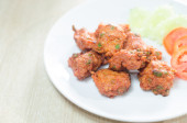 ciastka rybne na białym talerzu, smażone kulki rybne z sosem - azjatyckie tajskie jedzenie