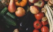 warzywa ze świeżymi organicznymi owocami i warzywami. zdrowa dieta rustykalny dom styl domowy chleb czerwony sól himalajska