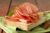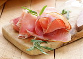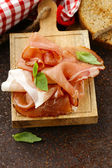 Wędzonej szynki Jamón (Parma) z liści bazylii na drewnianej desce