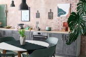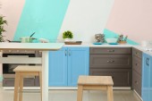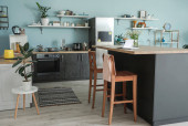 Zdjęcie "Wnętrze jasnej kuchni z meblami miętowymi" może być wykorzystywane do celów osobistych i komercyjnych zgodnie z warunkami zakupionej licencji Royalty-free. Obraz jest dostępny do pobrania w jakości wysokiej rozdzielczości do 5760x3840.