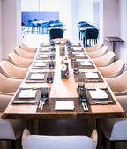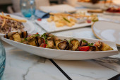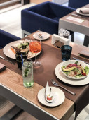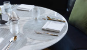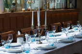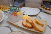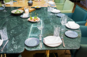 Stół świąteczny w restauracji z serem, miodem, miętą i winogronami. Miękkie naczynia kuchenne, talerze i szklanki na pierwszym planie.