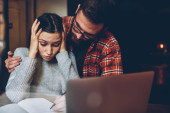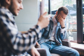 Niski kąt młodej kobiety w luźnym stroju siedzącej na krześle i dotykającej głowy podczas rozmowy z mężczyzną
