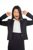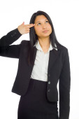 Asian young businesswoman dressed up as black angel pointing finger to head isolated on white background