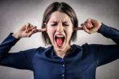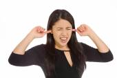 Asian young businesswoman dressed up as black angel shouting with hands in ear isolated on white background