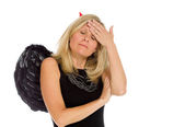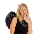 Zły Asian kobieta interesu młody siedzi na stołku wystrojony w górze równie Anioł szepcze wiadomość na białym tle