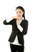 Asian young businesswoman sitting on stool in devil horns dont know what to do isolated on white background