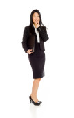 Happy Asian young businesswoman sitting on stool in devil horns hand on chin isolated on white background